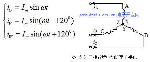 圖5-3表示最簡單的三相定子繞組AX、BY、CZ,它們在空間按互差1200的規律對稱排列。并接成星形與三相電源U、V、W相聯。則三相定子繞組便通過三相對稱電流:隨著電流在定子繞組中通過,在三相定子繞組中就會產生旋轉磁場(圖5-4)。