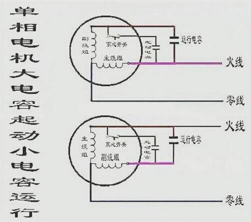 1、一般三相電機使用均為380V/丫型接法,改時要從丫點中引一根線,為了配合下面電路圖說明,暫時稱它為220Ⅴ電機的零線,取三相中的任意一相,我們暫時稱它為主繞組線圈,再取任意一相為副繞組,還有另外一相不用,不管它。副繞組與主繞組有一頭都是電機丫型接法的中性點,也就是上面我們假設的(零線),主繞組另一端引出來一根線,暫時稱它為火線。在副繞組的另一端出來需要并聯兩只耐壓≥450V的電容,一只為運行電容,電容另一端與暫時定的火線相聯接。另一只為啟動電容,它是一個由需要另外購買的(電機專用離心開關)此離心開關需要固定在電機尾部風扇軸上,隨電機轉動,另一端固定在靜止的殼體上,有二根導線與起動電容器一頭串聯,另一頭接到火線上。離心開關工作原理是它有二個離心球,當電機處于0速和剛起動時低速時,它的觸點是閉合導通的,也就是離心球沒有離心拋物形成作用力,當電機通電由靜止速度逐漸圓周加速到一定轉速時離心拋物作用力大于二個離心球的反作用力后,這時離心開關會翻轉工作狀態,由原來的常閉馬上變成常開,切斷起動電容器,留下一只運轉必須要有的,產生旋轉磁場的運轉電容,這也是為什么單相電機必須要有起動運轉電容,電機才會轉起來的主要原因。
