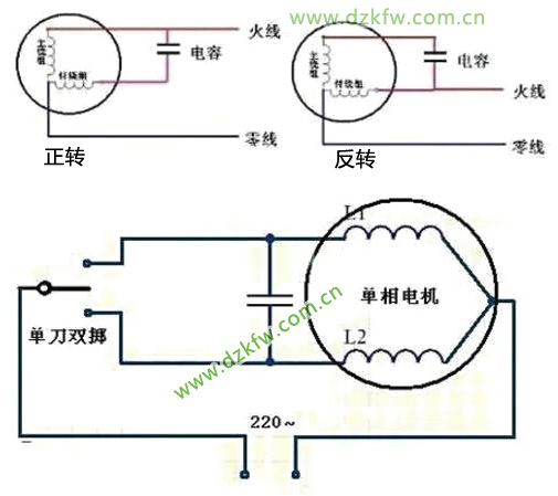4、上圖為改220單相電機的正反轉控制圖,由于主繞組與副繞組的匝數、漆包線的截面都一樣,正反轉時只是將它們之間靈活切換,故非常方便。