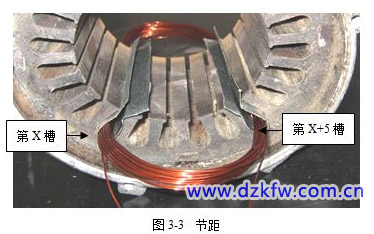 節距又叫跨距,是指嵌入電動機槽內的1 個線把的兩個有效邊之間的槽距(一般用槽數表示,它接近或等于電動機的極距),如圖3-3所示的最大的線把跨1~6槽,節距為5。即若設線把的節距為x,則該線把跨x槽~x+5槽。
