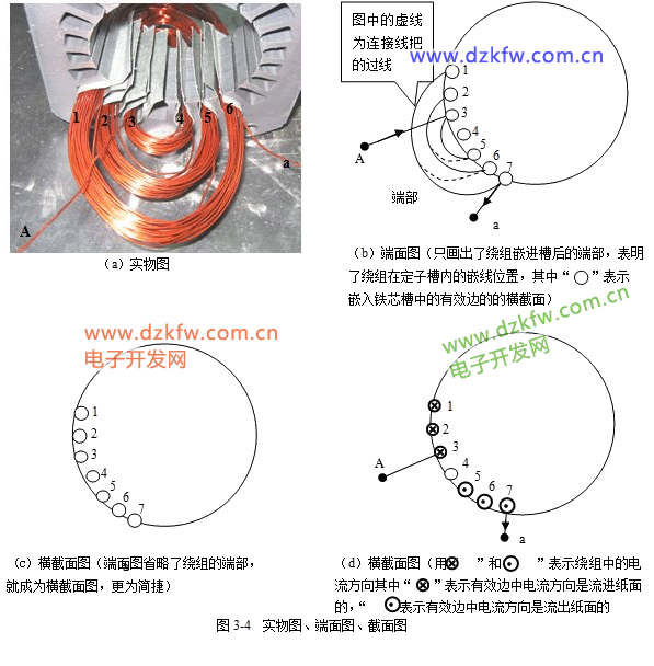某電機的一個極相組的實物圖、端面圖和截面圖如圖3-4所示(假設圖a中某時刻電流從A