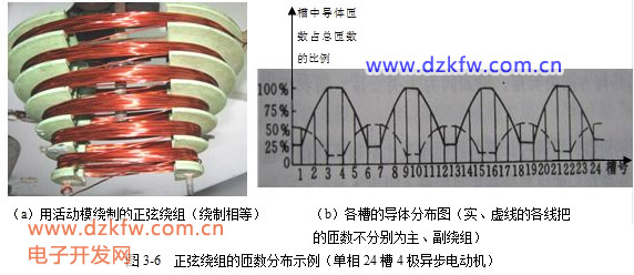 (1)匝數規律:正弦繞組一般都采用同心式結構,且一個極相組內的各線把的匝數不相等,且在各槽中的匝數是按正弦規律分配的。當電流流過各相繞組時,該相繞組建立的磁場在空間的分布就接近正弦波形,所以將這種結構的繞組稱為正弦繞組。如圖3-6所示。