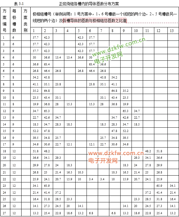 (3)正弦繞組的常用分布方案:為了更具體地了解正弦繞組在各槽中的匝數是按正弦規律分布的,下面介紹常用分布方案(部分),見表3-1。