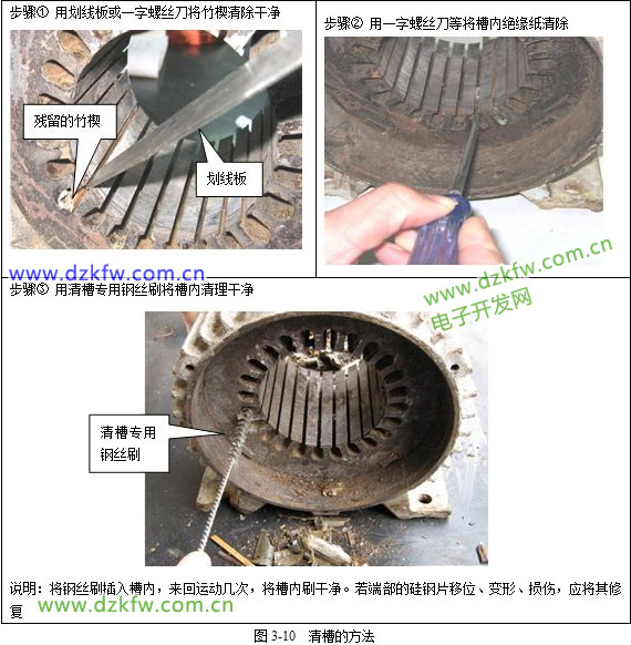 清槽就是在拆除舊繞組后,用清槽工具將殘留在每個槽內的絕緣紙、竹楔等雜物逐槽清除干凈。若不清理干凈,既占用槽內空間妨礙嵌線,也有可能損傷槽絕緣。清槽的常用方法如圖3-10所示。