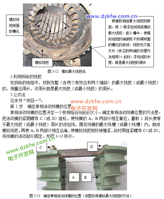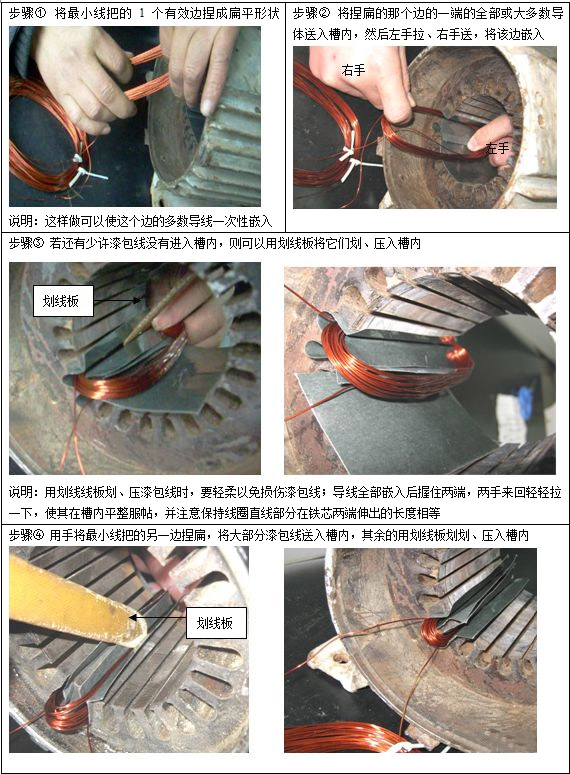 若線把做小了,會導致整個極相組嵌線困難,甚至損壞槽絕緣或漆包線的外表;若做大了,會導致裝配困難(不易裝上端蓋)、浪費漆包線、加重電動機發熱。可見,確定極相組各線把的大小非常重要,其常用方法有以下3種: