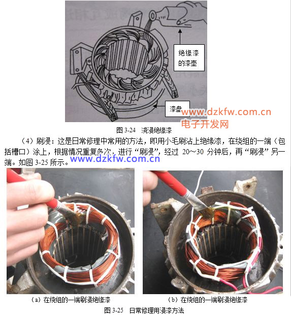 (3)澆浸:就是將電動機繞組放在漆盤上,用盛有絕緣漆的漆壺澆浸繞組的一端,一般要澆浸三次左右,過數十分鐘后,再用同樣的方法澆浸繞組的另一端,如圖3-24所示。