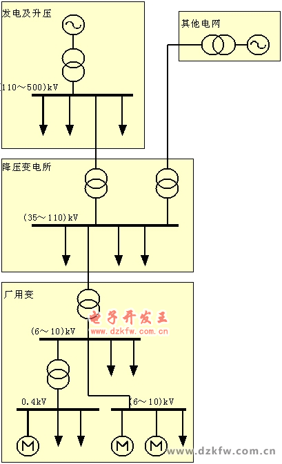 一個完整的電力系統由分布各地的各種類型的發電廠、升壓和降壓變電所、輸電線路及電力用戶組成,它們分別完成電能的生產、電壓變換、電能的輸配及使用。圖1 電力系統的組成示意圖