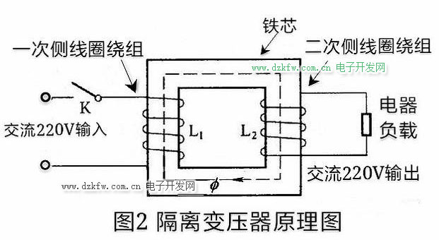 220V隔離變壓器雖然說是按照1:1(指它的輸入電壓和輸出電壓都是為220V),但是它的繞制匝數(shù)并不是按照1:1的比例來繞制的(即如上圖2所示L1、L2),這里涉及到電磁感應(yīng)的效率問題。