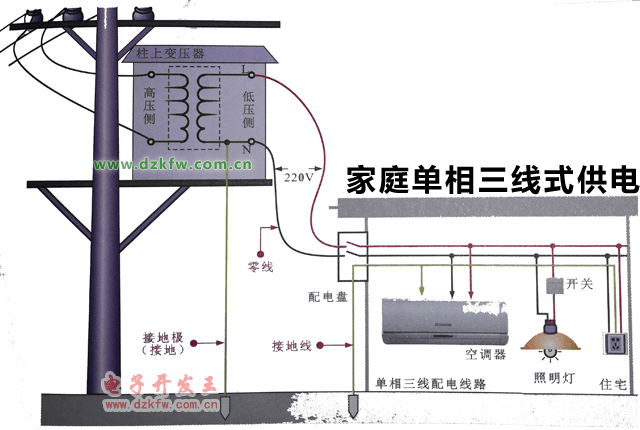 需要注意,三線式供電的零線在電源端接地,地線在本地用戶接地,兩者因地點不同可能存在電位差,簡單說就是用萬用表之類的測量電壓的設備可能測量到地線和零線之間有電壓,這是正常現象。