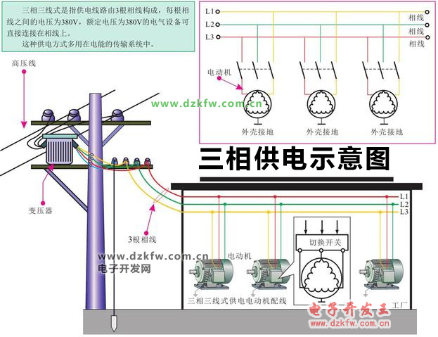 大部分工業和重大的電力設備都需要三相電壓。三相電壓系統是三個單相電壓系統的組合。實際上,住宅用電的供給是從三相配電系統中抽取其中的某一項相電壓。
