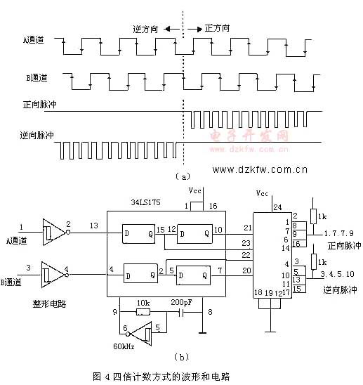 增量編碼器是以脈沖形式輸出的傳感器,其碼盤比絕對編碼器碼盤要簡單得多且分辨率更高。一般只需要三條碼道,這里的碼道實際上已不具有絕對編碼器碼道的意義,而是產生計數脈沖。它的碼盤的外道和中間道有數目相同均勻分布的透光和不透光的扇形區(光柵),但是兩道扇區相互錯開半個區。當碼盤轉動時,它的輸出信號是相位差為90°的A相和B相脈沖信號以及只有一條透光狹縫的第三碼道所產生的脈沖信號(它作為碼盤的基準位置,給計數系統提供一個初始的零位信號)。從A,B兩個輸出信號的相位關系(超前或滯后)可判斷旋轉的方向。由圖3(a)可見,當碼盤正轉時,A道脈沖波形比B道超前π/2,而反轉時,A道脈沖比B道滯后π/2。圖3(b)是一實際電路,用A道整形波的下沿觸發單穩態產生的正脈沖與B道整形波相‘與’,當碼盤正轉時只有正向口脈沖輸出,反之,只有逆向口脈沖輸出。因此,增量編碼器是根據輸出脈沖源和脈沖計數來確定碼盤的轉動方向和相對角位移量。通常,若編碼器有N個(碼道)輸出信號,其相位差為π/ N,可計數脈沖為2N倍光柵數,現在N=2。圖3電路的缺點是有時會產生誤記脈沖造成誤差,這種情況出現在當某一道信號處于‘高’或‘低’電平狀態,而另一道信號正處于‘高’和 ‘低’之間的往返變化狀態,此時碼盤雖然未產生位移,但是會產生單方向的輸出脈沖。例如,碼盤發生抖動或手動對準位置時(下面可以看到,在重力儀測量時就會有這種情況)。