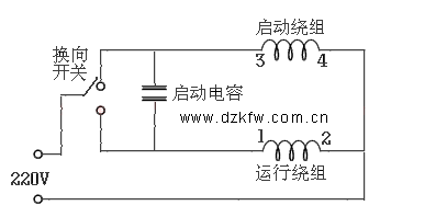圖4是帶正反轉倒順開關的接線圖,通常這種電機的起動繞組與運行繞組的電阻值是一樣的,就是說電機的起動繞組與運行繞組是線徑與線圈數完全一致的。一般洗衣機用得到這種電機。這種正反轉控制方法簡單,不用復雜的轉換開關。