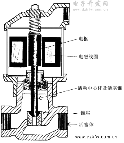 圖中畫的是電磁閥的截面圖,即所謂電磁閥。電磁線圈中如果沒有電流,則無磁場存在,電樞不受磁力但受壓力彈簧之推送。活塞中心桿是和電樞接在一起的,所以中心桿向下推,活塞錐即套進錐座。這樣從進口到出口之間的通路即被堵塞。如果線圈中有電流通過,產生磁場,磁力將電樞向上推。電樞必須克服彈簧下推的力量,才能把中心桿和活塞錐離開錐座,從進口到出口的通過即可暢通。電磁都是雙位置裝置,即不是全開就是全關。所以是開閉式控制系統所用的裝置。