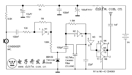 由于這些非門并聯,所以輸出阻抗很低,因此可以直接驅動1/4波長的天線。會有很多諧波在n4-n6輸出由于輸出N4 N6是方波。第九次諧波的10.7兆赫(96.3mhz)會因此在FM頻段的中心。作為音頻放大器,該電路采用N1。它會放大來自麥克風的音頻信號和變容二極管。該變電容的信號,將改變振蕩器的頻率,產生不同的頻率調制。