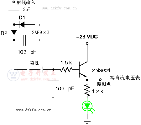 電路中,射頻輸入信號經2PF電容后,由D1、D2和10000PF電容對其2倍壓整流濾波。然后給三極管2N3904提供基極電流,驅動LED發光并在監測點提供直流電平輸出以駁接直流電壓表。電路中的磁珠用來吸收殘余射頻信號,抑制其對后級電路產生干擾。
