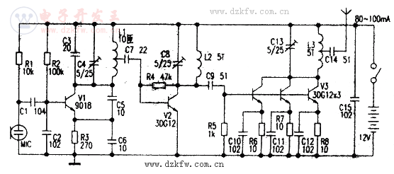 本調頻發射器分為高頻振蕩、倍頻和功率放大三級。電路中V1、C2--C6、R2、R3及L1組成電容三點式振蕩器,其振蕩頻率主要由 C3、C4和L1的參數決定,其振蕩頻率為44~54MHz,該信號從L1的中心抽頭處輸出,再經過C7耦合至V2放大,由C8和L2選出44~54MHz的二倍頻信號,即88-108MHz,此信號由C9耦合至V3進行功率放大,V3由3只3DGl2三極管并聯組成,可擴大輸出功率。該電路正常工作時,電流約80-100mA。組成V3的三只3DG12可加上適當的散熱片,以防過熱。制作時L1~L3用0.31mm漆包線在直徑3.5mm圓棒上單層平繞脫胎而成。