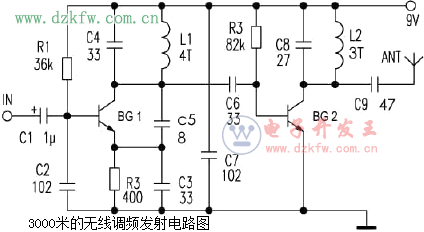 如圖所示。工作電壓為9V,工作電流2~6mA,元件參數(shù)如圖可知,BG1為9018、BG2為C1959(也可以是9018,不過功率較小,如果是D-40可以將射距離擴大到1000米,D-40在電子商店很難買到。),L1、L2為0.5mm的漆包線在0.5的圓棒上繞4和3圈,工作電壓可以提高到12V,這樣發(fā)射的距離可增加,不過頻率會變化,整個電路最好用電池供電,可達到音質和穩(wěn)頻的最佳效果,調試時先關閉BG2的工作,調好你所需的頻率,最后打開BG2電路調節(jié)功率。本電路我是采用BG1--D40、BG2--C1970效果很好,電壓12V,BG1工作電壓6V,距離是3000米(定向實驗)。如果你要采用D-40,請你要注意D-40的工作電壓是6V!最好將本電路裝在一個鐵盒里,輸入端加一個衰落減網(wǎng)絡。