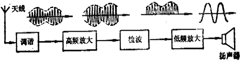收音機接收的經過調制的高額振蕩電流(對應圖講解),這種電流通過收音機的耳機或揚聲器,并不能使它們振動而發聲,為什么呢,假定某一個半周期電流的作用是使振動片向某個方向運動,下一個半周期電流就以幾乎同樣大的作用使振動片向反方向運動.高頻電流的周期非常短,半周期更短,而振動片的慣性相當大,所以在振動片還沒有來得及在電流的作用下向某個方向運動的時候,就立刻有一個幾乎同樣大的作用要使它向反方向運動,結果振動片實際上不發生振動.要聽到聲音,必須從高頻振蕩電流中"檢"出聲音信號,使揚聲器(或耳機)中的動片隨聲音信號振動。