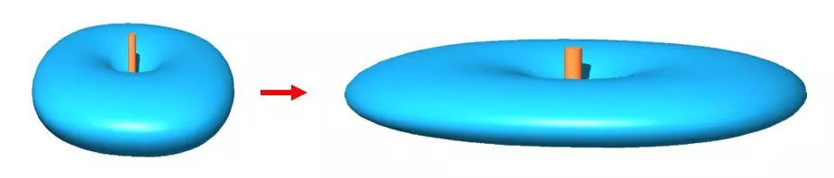 根據能量守恒原理,能量既不會增加也不會減少,如果要提高水平方向的發射能量,就要削弱垂直方向的能量。因此就只有把標準半波陣子的能量輻射方向圖拍扁了,如下圖所示。