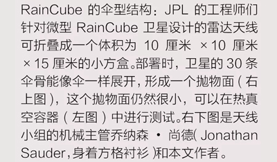 很顯然,我們要克服一些棘手的設計挑戰。在經過激烈的頭腦風暴后,由喬納森•尚德(Jonathan Sauder)、馬克•湯姆森(Mark Thomson)、理查德•霍奇思(Richard Hodges)、 葉海亞•拉赫馬特-薩米(Yahya Rahmat-Sami)以及我本人組成的RainCube天線研究小組,選定了一種天線,這種天線的工作原理就好像把傘裝入盒子里一樣。在限定了可利用體積的條件下,這種方法是最簡單的解決方案。