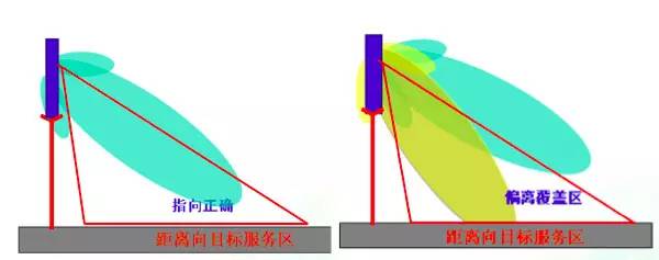 觀察下圖的垂直面方向圖。波束應該適當下傾,下傾角度最好使得最大輻射指向圖 中目標服務區的邊緣。如果下傾太多(黃色),服務區遠端的覆蓋電平會急劇下降;如果下傾太少,覆蓋在服務區外,且產生同頻干擾問題。