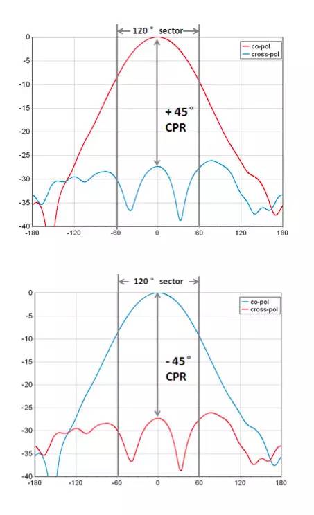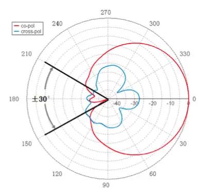 為了獲得良好的上行分集增益,要求雙極化天線應該具有良好的正交極化特性,即在±60º的扇形服務區內,交叉極化方向圖電平應該比相應角度上的主極化電平有明顯的降低,其差別(交叉極化比)在最大輻射方向應大15dB,在±60º內應大于10dB,最低門檻也應該大于7dB,如圖所示。如此,才可以認為兩個極化接收到的信號互不相關。