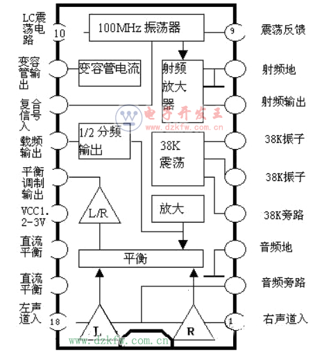 用BA1404制作調頻立體聲發射電路,BA1404為調頻立體聲發射專用集成電路,由于工作性能優良,也常用于無線電遙控.BA1404所需工作電源電壓低1.5V~3V,功耗小,電路結構完善,所需外接元件少,工作穩定可靠. 不過想用好BA1404應注意以下事項: (1)為了使發射機的頻率特性與FM廣播接收機的頻率特性一致,需在左、右聲道輸人端串接一個時間常數為50μs的預加重電路,如圖所示。當用于無線電遙控發射電路時,可將左、右輸入端合并,用0.1~1μF電容與信號輸入端連接。 (2)12~14腳外接R、C元件,是保證立體聲調制器的輸出信號與導頻信號組合成復合信號時,兩者相位特性一致,不使聲道分離度惡化,一般情況下不得變更。如需變更應進行實際試驗后確定。 (3)立體聲調制時,調制信號的聲頻上限為19kHz,若輸入信號中伴有脈沖性信號,為了防止出現蜂音和聲道分離度惡化,應在輸入端串接低通濾波器。 (4)16~17腳是用于調節平衡的引腳,這兩腳即使什么也不接,也可以獲得滿意的分離度。在通常的使用中總是接一個50kΩ的電位器,通過調節直流平衡,使分離度進一步提高。 (5)11腳的直流輸出電壓由內部電路固定為VDD~0.7V。