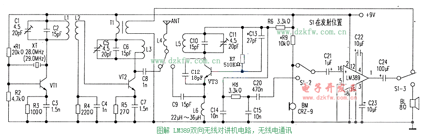 石英晶體XT、VT1等組成高穩定度的載波振蕩器.振蕩信號由L1耦合至L2.由VT2進行載波功率放大。C1、C2、L1和C5、C6、L3組成兩個并聯選頻回路.當它們的諧振頻率與XT固有振蕩頻率一致時.可獲得最大的發射功率,一般通話距離可達2.5km~3km。當S1置發射位置時(附圖所示位置),話筒BM拾取的音頻信號經LM389進行功率放大,加至調制變壓器T1,通過音頻信號電平高低不同,控制載波功率放大管VT2的工作電壓,實現對振蕩信號的幅度調制(調幅),然后經C8、L4送至天線ANT.向空間發射。R1、R2決定、VT1工作點。