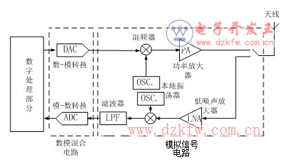 這是一個(gè)無線通信收發(fā)機(jī)(《span》tranceiver)的系統(tǒng)模型,它包含了發(fā)射機(jī)電路、接收機(jī)電路以及通信天線。這個(gè)收發(fā)機(jī)可以應(yīng)用于個(gè)人通信和無線局域網(wǎng)絡(luò)中。在這個(gè)系統(tǒng)中,數(shù)字處理部分主要是對(duì)數(shù)字信號(hào)進(jìn)行處理,包括采樣、壓縮、編碼等;然后通過A/D轉(zhuǎn)換器轉(zhuǎn)換器變成模擬形式進(jìn)入模擬信號(hào)電路單元。