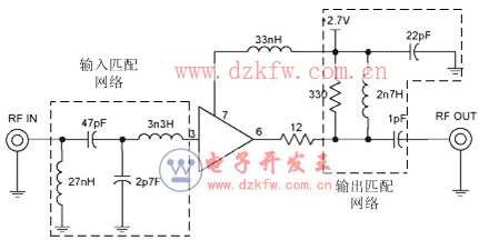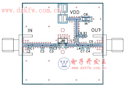 上圖給出了這個(gè)放大器的電路板圖, 注意到輸入信號(hào)是通過一個(gè)經(jīng)過匹配濾波網(wǎng)絡(luò)輸入放大模塊。放大模塊一般采用晶體管的共射極結(jié)構(gòu),其輸入阻抗必須與位于低噪聲放大器前面的濾波器的輸出阻抗 相匹配,從而保證最佳傳輸功率和最小反射系數(shù),對(duì)于射頻電路設(shè)計(jì)來說,這種匹配是必須的。此外,低噪聲放大器的輸出阻抗必須與其后端的混頻器輸入阻抗相匹 配,同樣能保證放大器輸出的信號(hào)能完全、無反射的輸入到混頻器中去。這些匹配網(wǎng)絡(luò)是由微帶線組成,在有些時(shí)候也可能由獨(dú)立的無源器件組成,但是它們?cè)诟哳l 情況下的電特性與在低頻的情況下完全不同。圖上還可以看出微帶線實(shí)際上是一定長度和寬度的敷銅帶,與微帶線連接的是片狀電阻、電容和電感。