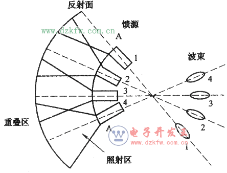 這種天線反射器的焦點分布在一個曲線AA上,在此曲線上裝置多個饋源用于多波束接收。波束的軸線與各饋源的軸線重合,且有類似的增益和方向圖。若把各饋源制成不同頻段和極化時,則成為一個多波束、多頻段和多極化的天線。這種天線的每個饋源只照射反射器的一部分,當允許相鄰饋源的照射區有部分重疊時,反射區的面積就可以做得小一些。