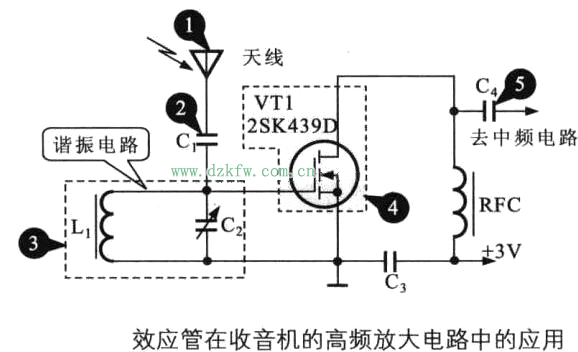 場效應管在收音機的高頻放大電路中的應用見下圖。