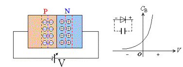勢壘電容是由空間電荷區(qū)的離子薄層形成的。當(dāng)外加電壓使PN結(jié)上壓降發(fā)生變化時,離子薄層的厚度也相應(yīng)地隨之改變,這相當(dāng)PN結(jié)中存儲的電荷量也隨之變化,猶如電容的充放電。勢壘電容的示意圖見圖01.09。