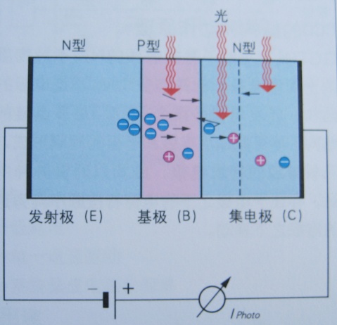 可以視為光電二極管中安裝放大器的晶體管。    形成基極、集電極的PN接合是一種感光的二極管。通過光,在這個接合面產生的光電流將向發射極流動。通過晶體管的放大作用,這種發射極電流將放大到最初光電流的幾百倍。