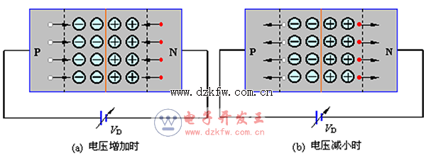 勢壘電容CB描述了PN結勢壘區空間電荷隨電壓變化而產生的電容效應。PN結的空間電荷隨外加電壓的變化而變化,當外加電壓升高時,N區的電子和P區空穴進入耗盡區,相當于電子和空穴分別向CB“充電”,如圖(a)所示。當外加電壓降低時,又有電子和空穴離開耗盡區,好像電子和空穴從CB放電,如圖(b)所示。CB是非線性電容,電路上CB與結電阻并聯。在PN結反偏時結電阻很大,CB的作用不能忽視,特別是在高頻時,它對電路有較大的影響。