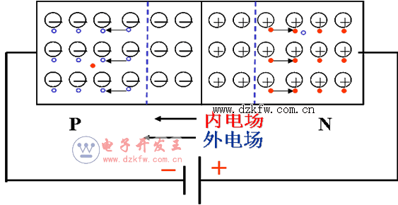 加正向電壓(正偏)——電源正極接P區,負極接N區,外電場的方向與內電場方向相反。