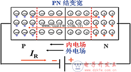 加反向電壓(反偏)——電源正極接N區,負極接P區,外電場的方向與內電場方向相同。