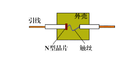 點(diǎn)接觸型二極管 點(diǎn)接觸型二極管是在鍺或硅材料的單晶片上壓觸一根金屬針后,再通過(guò)電流法而形成的。