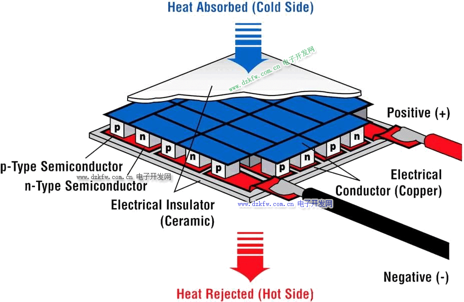 A typical single stage cooler consists of two ceramic plates with p- and n-type semiconductor material bismuth telluride) between the plates. The elements of semiconductor material are connected electrically in series and thermally in parallel. When a positive DC voltage is applied to the n-type thermoelement, electrons pass from the p- to the n-type thermoelement and the cold side temperature will decrease as heat is absorbed. The heat absorption (cooling) is proportional to the current and the number of thermoelectric couples. This heat is transferred to the hot side of the cooler, where it is dissipated into the heat sink and surrounding environment.