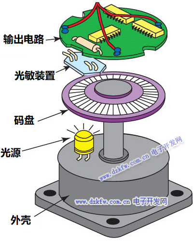 光電編碼器(optical encoder)的組成包括:連接軸(Shaft)、碼盤(Code disk)、光源(Light Source)、輸出電路(Output circuit)及外殼和連接法蘭等,如下圖: