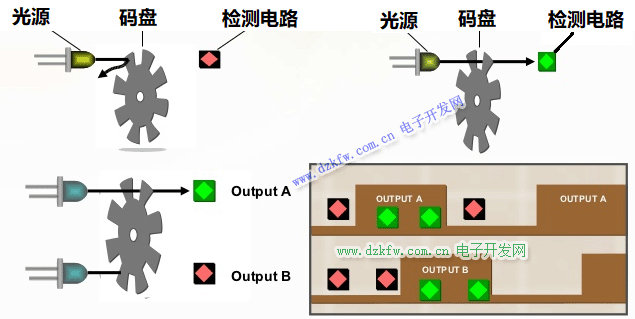 上述碼盤結構只有1圈光柵,在使用一路光源的情況下只有1路電脈沖信號輸出,這往往不能滿足實際要求,因為在實際應用中我們往往需要檢測電機是正轉還是反轉,有時候還需要進行零點檢測。
