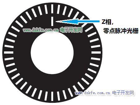 除了A/B相,在實際應用中,有的編碼器還提供零點脈沖信號。零點脈沖信號是在碼盤上增加一個同心的光柵孔,每轉一圈發出一個脈沖,其輸出信號稱為Z相(Zero),如下圖: