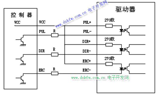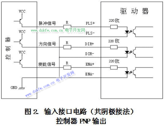 步進驅動器控制信號連接:上位機的控制信號可以高電平有效,也可以低電平有效。當高有效時,把所有控制信號的負端連在一起作為信號地,低有效時,把所有控制信號的正端連在一起作為信號公共端。