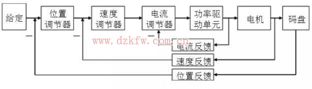 有刷直流伺服電機(jī)驅(qū)動(dòng)器:電動(dòng)機(jī)的工作原理和普通的直流電機(jī)完全相同,驅(qū)動(dòng)器為三閉環(huán)結(jié)構(gòu),從內(nèi)到外分別為電流環(huán)、速度環(huán)、位置環(huán)。電流環(huán)的輸出控制電機(jī)的電樞電壓,電流環(huán)的輸入為速度環(huán)PID的輸出,速度環(huán)的輸入為位置環(huán)的PID輸出,位置環(huán)的輸入即是給定輸入,控制原理圖如上圖。
