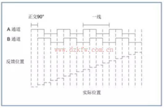一個編碼器的分辨率依賴于其編碼器的刻線數(增量編碼器)或者編碼器碼盤模式(絕對值編碼器)。一般來說,分辨率是一個固定值,一旦編碼器被制造出來就沒辦法再增加刻線數或者編碼。diangon.com但是增量編碼器可以通過信號細分來增加分辨率,例如,方波增量編碼器(HTL/TTL)輸出增量方波信號,通過每次記錄每個增量通道(信號A)的上升沿和下降沿,可以提高兩倍的編碼器分辨率。這樣當我們記錄兩個通道(信號A和B)的上升沿和下降沿時,我們可以提高四倍的編碼器分辨率(4倍頻),如下圖所示。