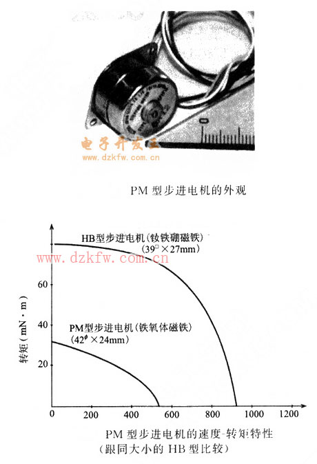 下圖示為PM型步進電機的外觀及PM型步進電機(42×長度27mm,步距角7.5°)的速度-轉矩特性[與尺寸接近的 HB型步進電機(39×長度27mm,步距角1.8°)比較]。因為HB型為方形,其對角線為42mm以上,而且轉子為永久磁鐵,PM型為便宜的鐵氧體磁鐵,HB為釹鐵硼磁鐵,極對數相同,且PM型的氣隙比HB型大3倍以上,故轉矩差如此之大也是必然。關于最高轉速和電氣時間常數(線圈電感除以電阻之值)的差異,僅供參考。
