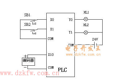 常用的旋轉編碼器有5條引線,其中3條是脈沖輸出線,1條是COM端線,1條是電源線(OC門輸出型)。電源可以是外接電源,也可直接使用PLC的電源。電源“-”端要與編碼器的COM端連接,“+ ”與編碼器的電源端連接。編碼器的COM端與PLC輸入COM端連接,A、B、Z兩相脈沖輸出線直接與PLC的輸入端連接,A、B為相差90度的脈沖。旋轉編碼器還有一條屏蔽線,使用時要將屏蔽線接地,提高抗干擾性。