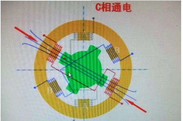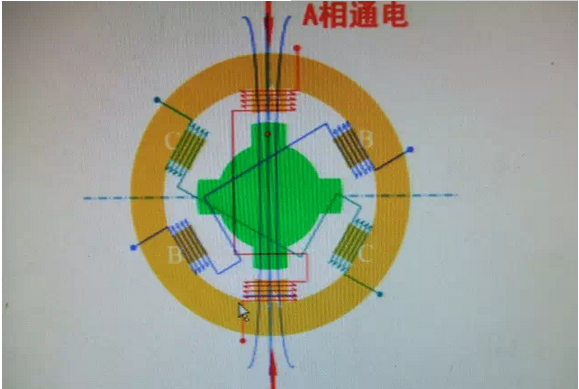 當某相定子勵磁后,它吸引轉子,轉子的齒與該相定子磁極上的齒對齊,轉子轉動一個角度,換一相得電時,轉子又轉動一個角度。如此每相不停地輪流通電,轉子不停地轉動。