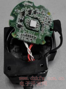 先來看右側的編碼器,編碼器與電機是非接觸的,總共有四根導線引出。通過中間的傳感器來獲取電機運行參數。下面是編碼器線路板的正面和背面。