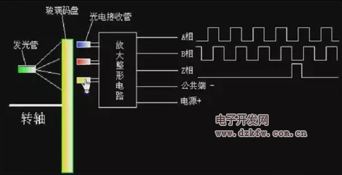 編碼器的工作原理:如下圖,發光管發光通過玻璃碼盤的條紋由光電接收管接收,當電機旋轉時碼盤跟著轉動,由于碼盤上是一些明暗相間的條紋,所以光電接收管接收到的就是一些光脈沖,光電接收管把光信號轉換成電信號,電信號再通過放大整形電路轉換成我們需要的矩形脈沖。由于碼盤上A相和B相所刻的條紋是相間隔的,因此放大整形電路輸出的A相和B相脈沖存在一個相位差,這里我們要求A相和B相脈沖的相位差為90度。由于碼盤上Z相只刻有一個條紋,所以電機旋轉一周只產生一個Z相脈沖。我們這里所講的編碼器為相對式編碼器,編碼器除了相對式編碼器還有一種為絕對式編碼器,有些伺服電機也會采用絕對式編碼器。